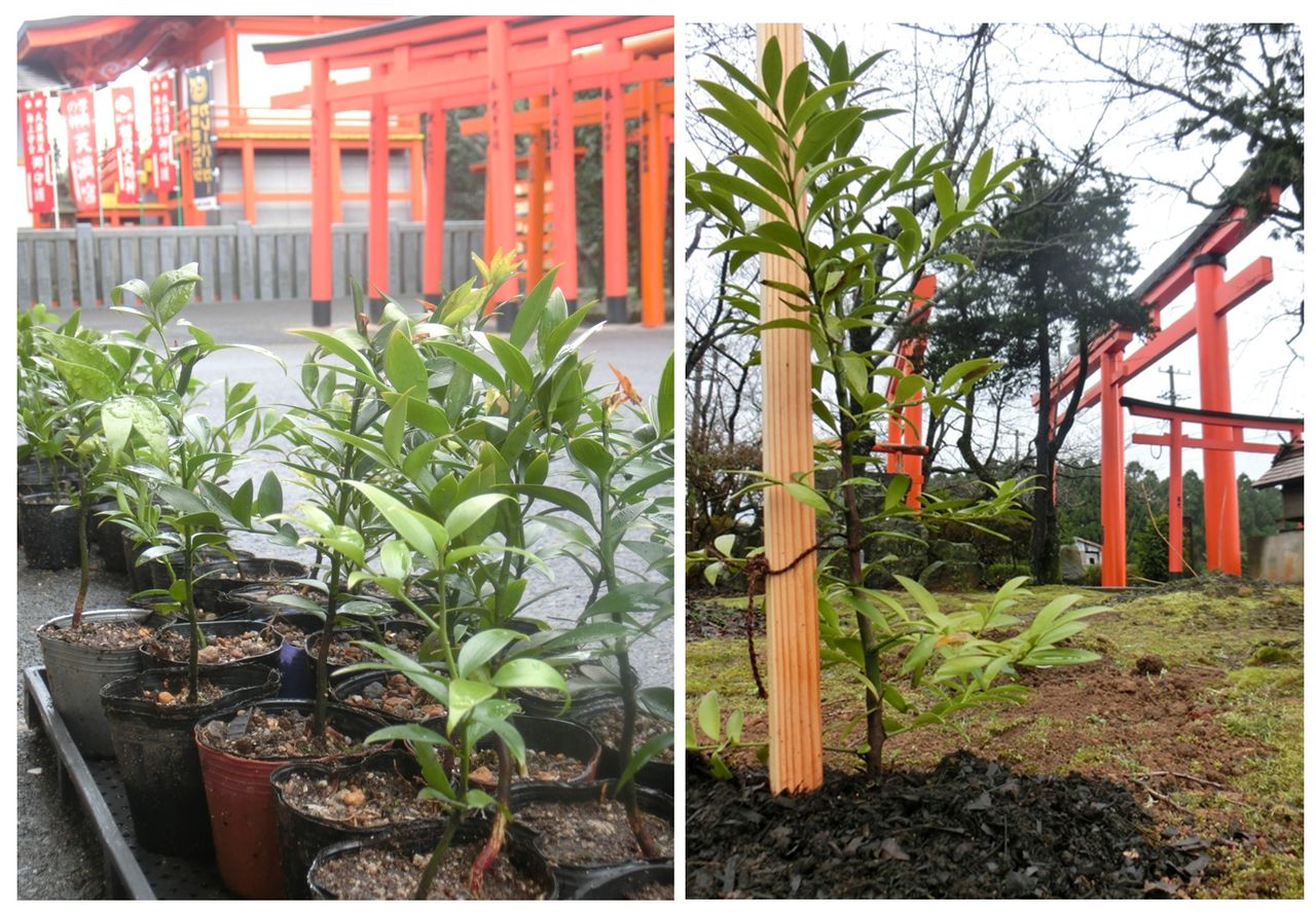 2016年03月22日 熊野速玉大社 ◆◆ 熊野速玉大社 ◆◆✻熊野速玉大社から小さな梛木の苗をいただき3年たちました。✻少し暖かくなったので、境内に6本植栽しました。✻残りの苗はポットに植え替えしました。✻ナギの葉は中央に葉脈がなくなかなか葉をひきちぎることができません。そのため男女の縁だけでなく、大切な人とのご縁を結んだり商売繁盛のご利益を授けてくれるとも言われています。✻すべての苦難を“なぎ払う”とされ海の安全以外にも様々な災厄除けのお守りとされています。 「社務日誌」カテゴリの最新記事 < 前の記事次の記事 >