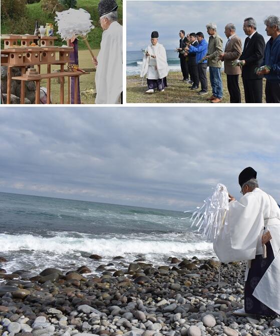 2025年11月20日 りゅうぐんさん ◆◆ りゅうぐんさん ◆◆ ✻海の神さまの大綿津見神(おおわたつみ)のお祭りをご奉仕させ ✻ていただきました。 ✻箆津(のつ)灘にお祀りされた「りゅうぐんさん」の1年に1回 ✻のお祭りです。 ✻海の恩恵に感謝し、海洋国家日本の繁栄を祈願しました。 ✻参列者の方に神饌の12個のみかん、お米、酒を大海原に捧げ、玉 ✻串を奉り拝礼、滞りなく神事を執り納めました。 ✻同時に美保関沖事件(昭和2年)で亡くなられた将校たち119柱の ✻慰霊祭も斎行しました。 ✻穏やかな大海原でした。 「社務日誌」カテゴリの最新記事 < 前の記事次の記事 >